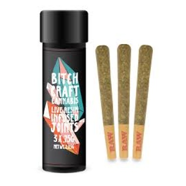 Bitch Craft's Lucy in the Sky 3-pack pre-rolls are your ticket to a euphoric journey. Infused with live resin, these .75g joints deliver a potent 34.9% THC experience. Expect a harmonious blend of relaxation and upliftment, with a citrusy aroma and earthy undertones. Whether you're seeking creative inspiration or a peaceful escape, Lucy in the Sky has got you covered.